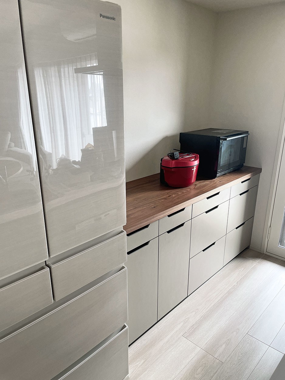 全体的な色味に合わせ本体はグレージュ・天板はウォールナット材でオーダー頂きました。